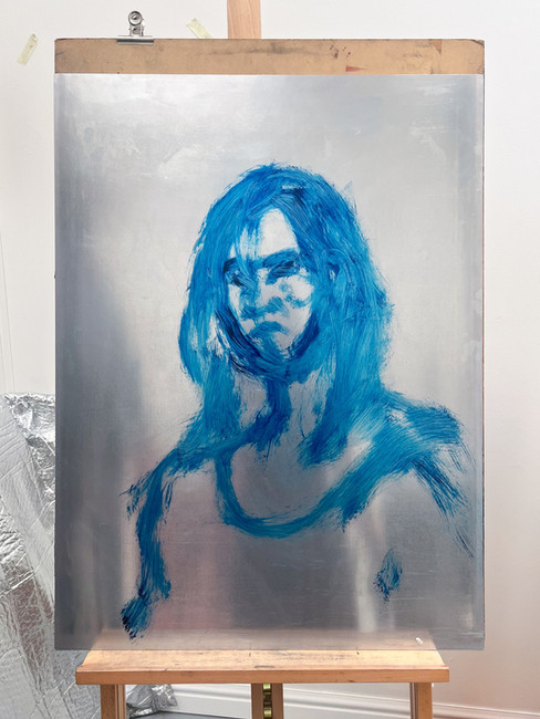 The final self-portrait I made channels feelings surrounding a loss of identity, sadness and grief. I use a lot of prussian blue in my work - to me, it is an emotional colour with a broad range of tonal values - and for the context of this portrait, it felt like the right colour to use. Just looking at the timestamp of my photos, I painted my plate within 3 hours before printing. The time frame in which I work, coupled with my mark-making tools and the potential for unpredictable distortion, helps me to express (rather than define) emotions.