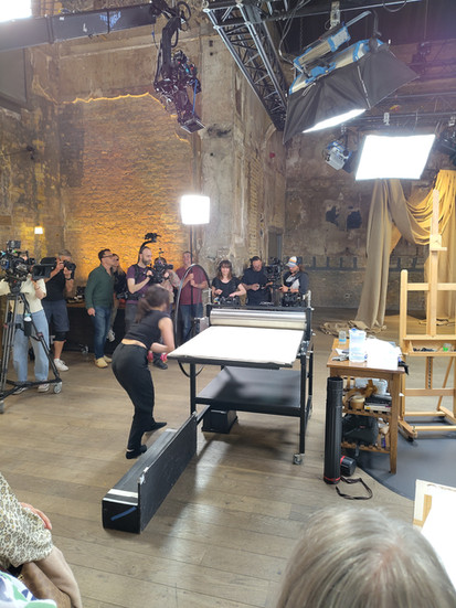 The Etching Press: Before any of the filming began, Jenny Gunning arrived at Battersea with her beautiful press! Not knowing the exact pressure I needed for my monotypes, we decided to set the pressure as Jenny would for one of her etchings, and made a 'ghost print' to see the embossing/ impression the unpainted plate left on my paper. Not wanting to risk ink smearing down the page or paper cockling under the rollers, we decided to reduce the pressure a smidge. This did run the risk of the monotype printing too light, but it was more forgiving than ink smearing down the page. After setting the pressure, we made several registration marks on the print bed, where I was to place my plate and paper later on.